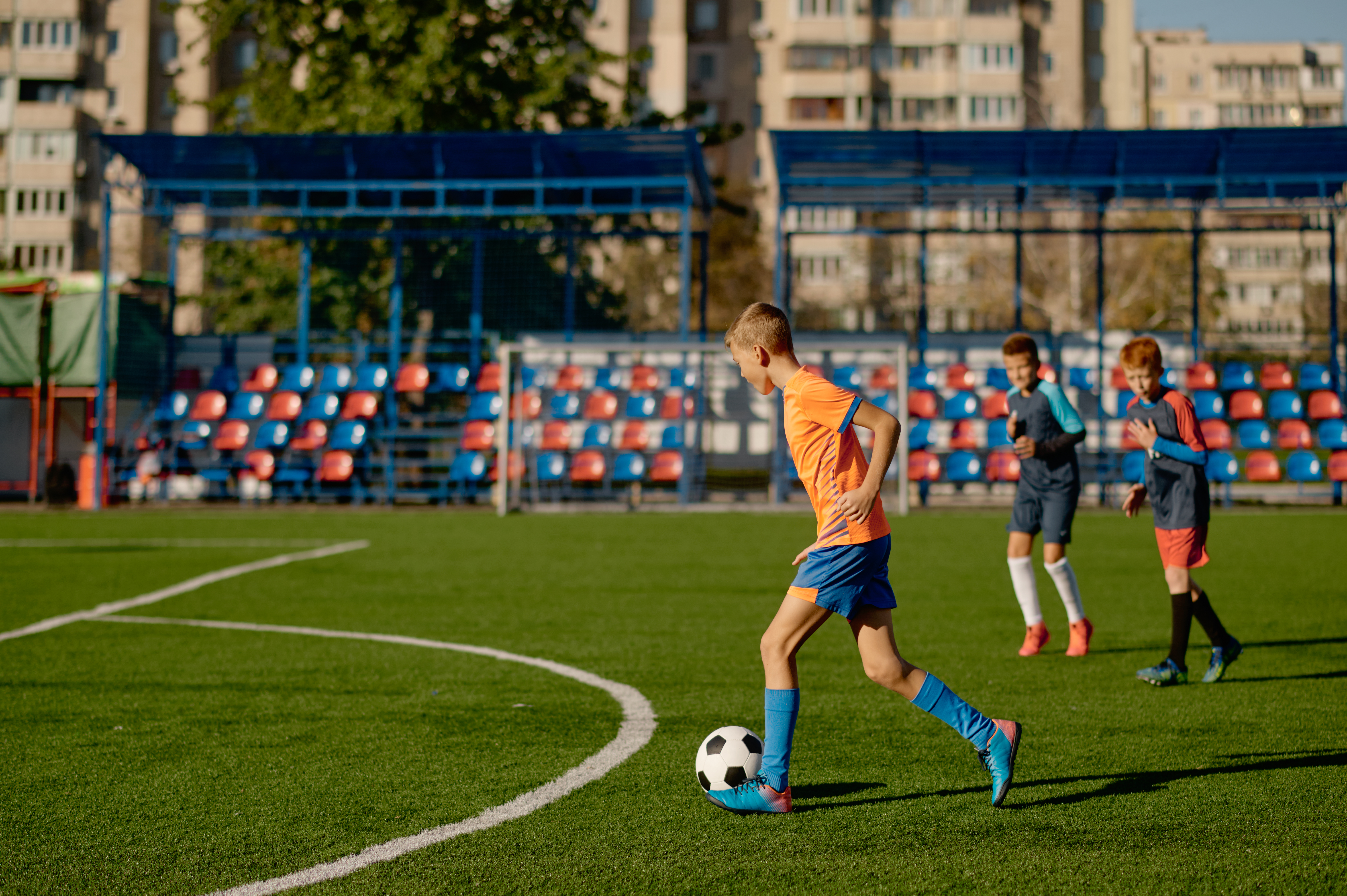 The soccer-field photo shows kids practicing coordinated, coached drills — t...